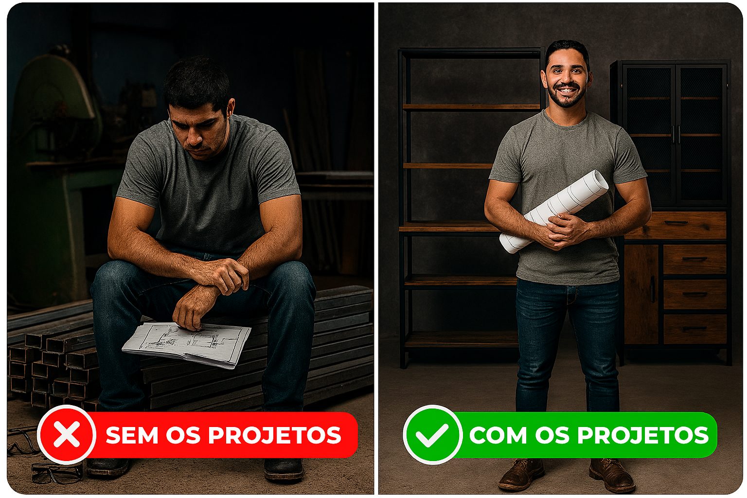 Aprenda os segredos, técnicas e truques que todo profissional de ponta usa no dia a dia. Este manual é o atalho pra você evitar erros caros, ganhar mais produtividade e entregar móveis industriais com acabamento de alto nível. É como ter um mestre experiente te orientando em cada corte e solda.